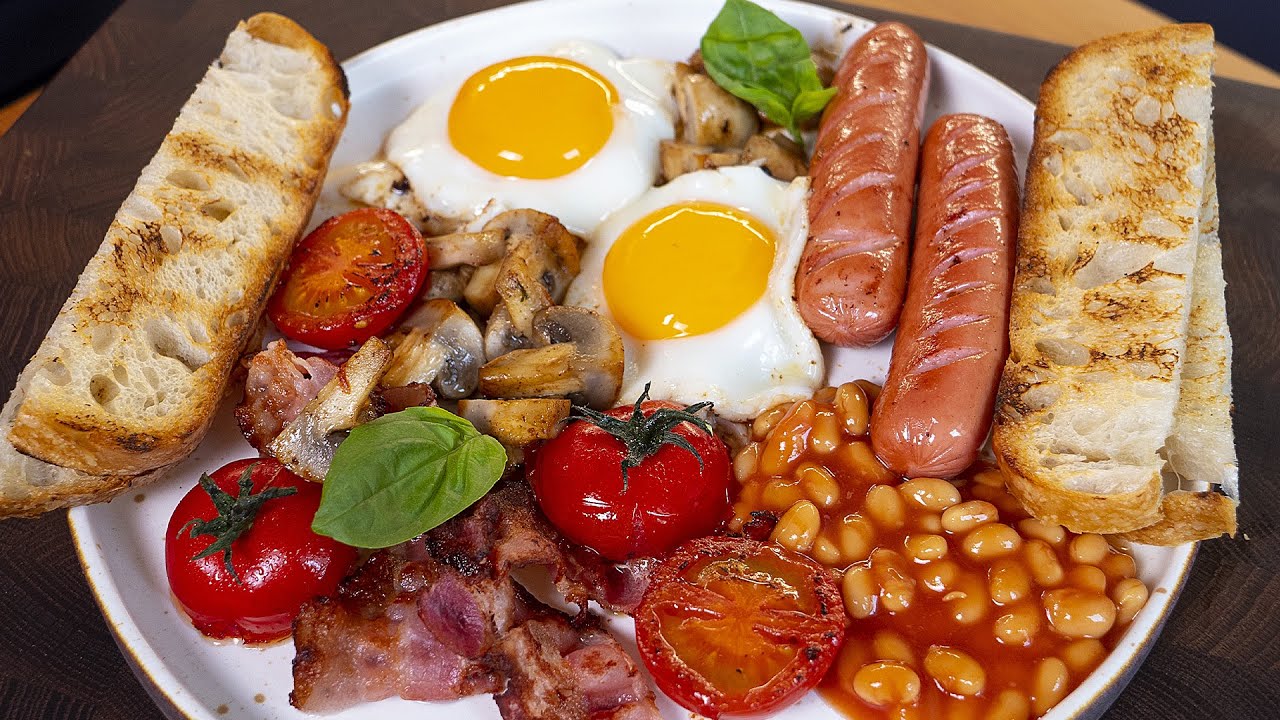 The traditional ingredients include: eggs (fried or soft-boiled), bacon (always back bacon—with a strip of meat), sausages (pork, with herbs), tomatoes (baked whole), mushrooms (fried in butter), beans in tomato sauce (Heinz is a classic), toast, or fries. All of this is served hot on a single plate, often with ketchup and mustard. The main rule: everything should be freshly cooked, with a crispy skin or soft center—no compromise.