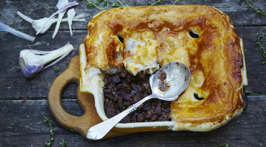 Steak and pie is the British answer to the winter blues. It’s braised beef in a rich gravy, topped with puff pastry, and baked until golden brown. The dish originates from the 19th century, when housewives used inexpensive cuts of meat, transforming them into masterpieces through long braising.